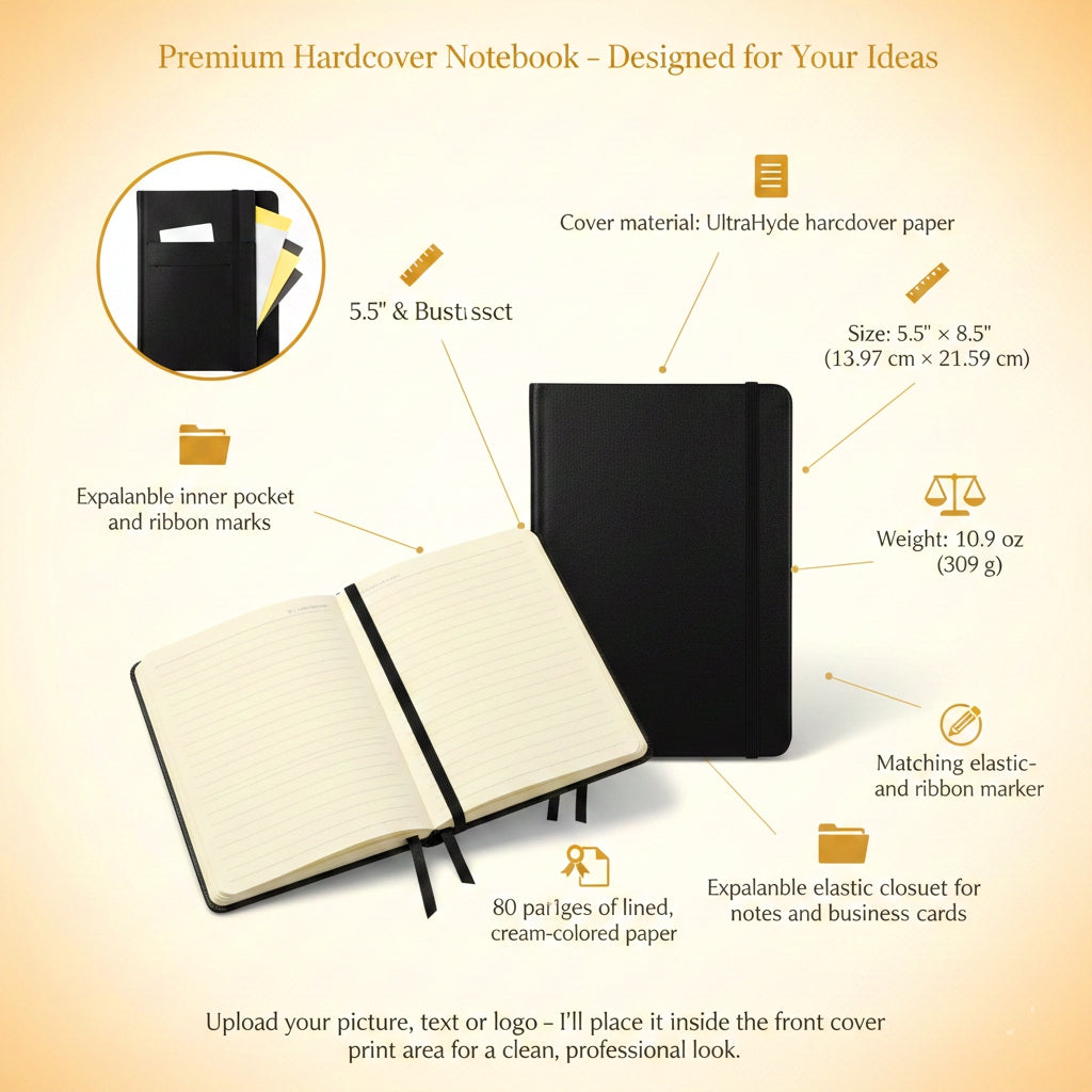 Turn your ideas, dreams, and daily notes into something truly personal. This custom hardcover notebook lets you add your own photo, logo, or motivational quote on the front cover, while keeping a premium, minimal look.