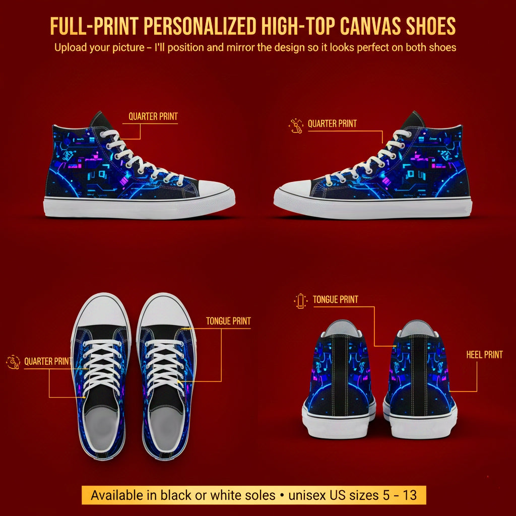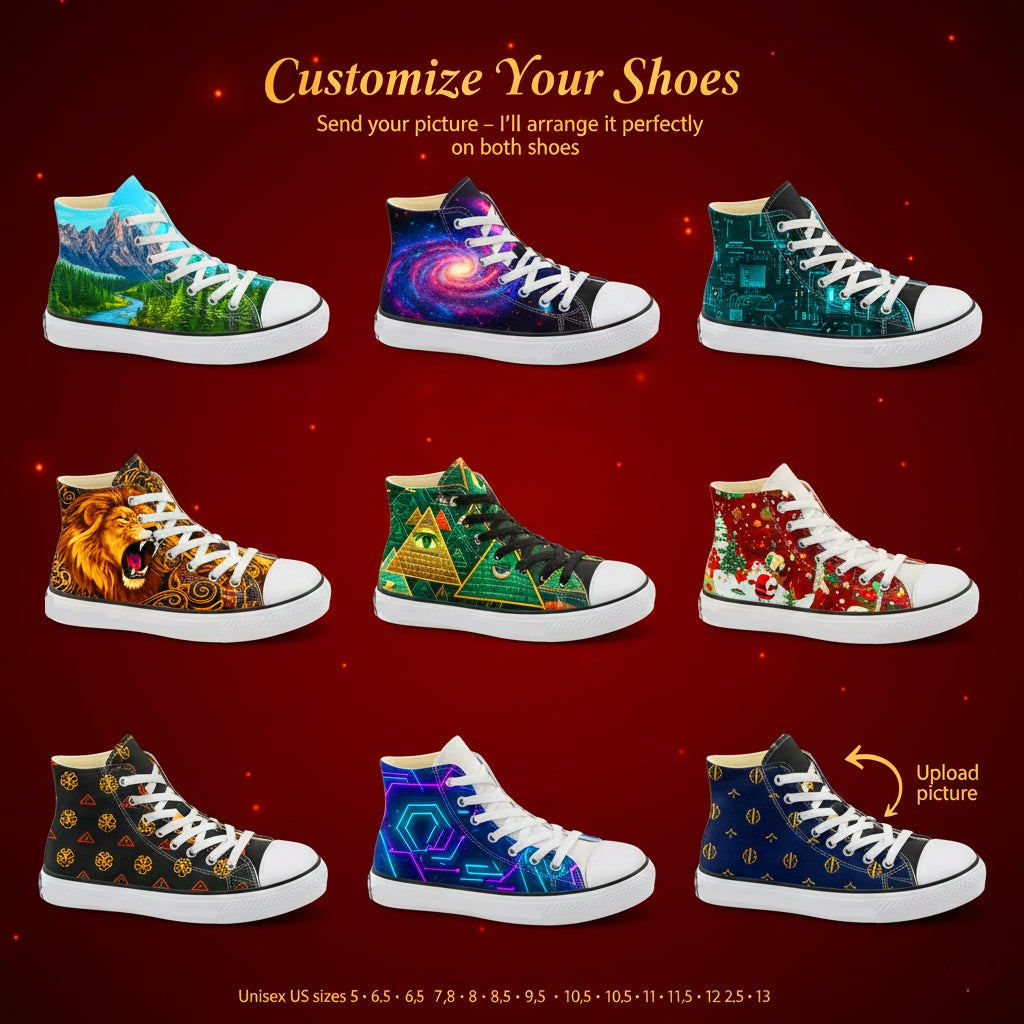 Design your own custom high-top canvas shoes and turn every step into art. Upload your favorite picture – nature, futuristic tech, Christmas vibes, your logo – and I’ll carefully adjust the layout so it wraps beautifully around both shoes, front, sides and heel.