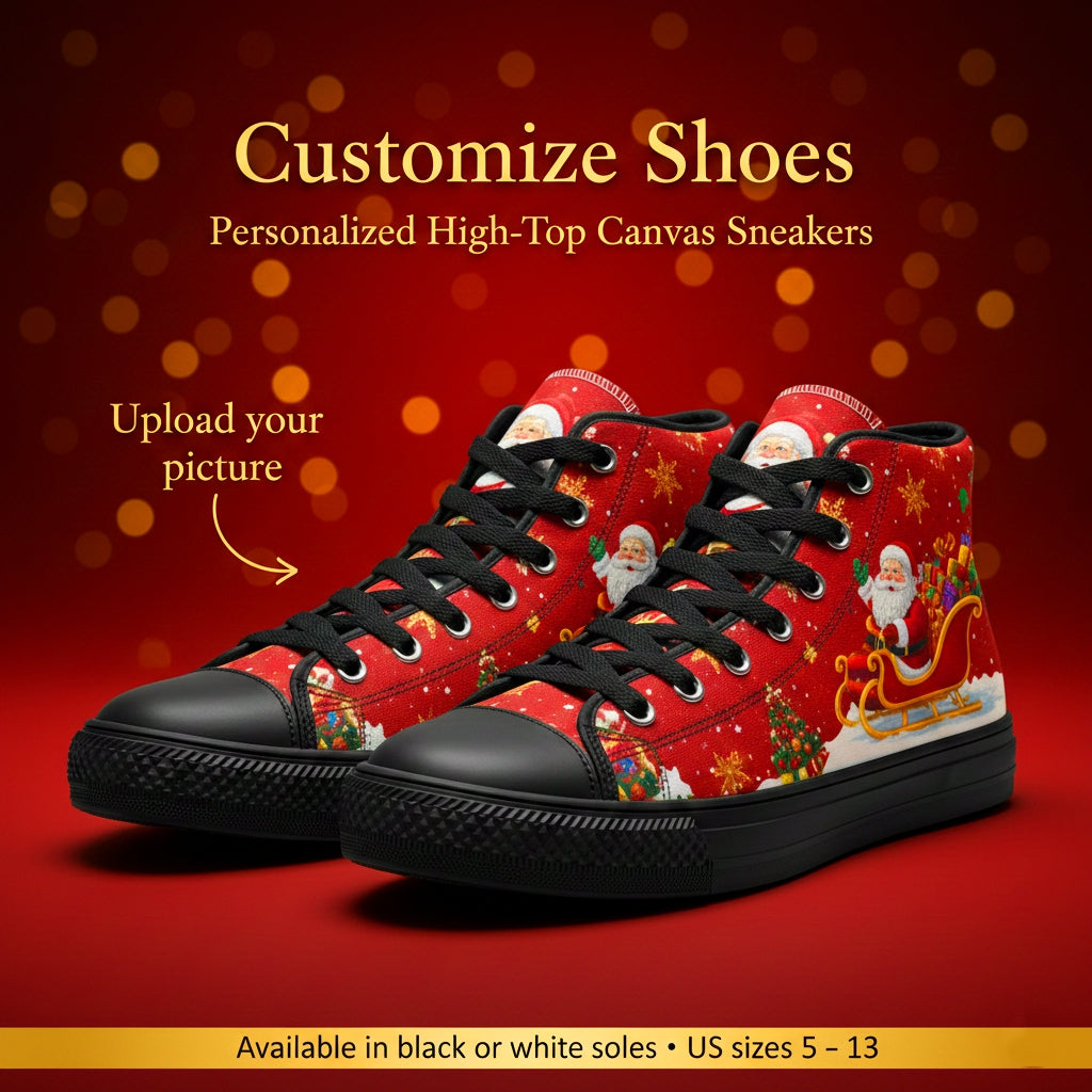 Create your own high-top canvas shoes with a full-print design. Upload your picture and I’ll arrange it perfectly on both shoes. Available in black or white, men’s US sizes 5–13 – the ultimate personalized Christmas gift.